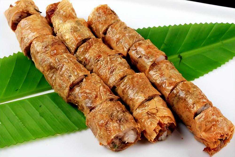 6.将腐皮(油皮)摊开,放入粉丝段、香菇丝和肉馅,用手卷起来摆。