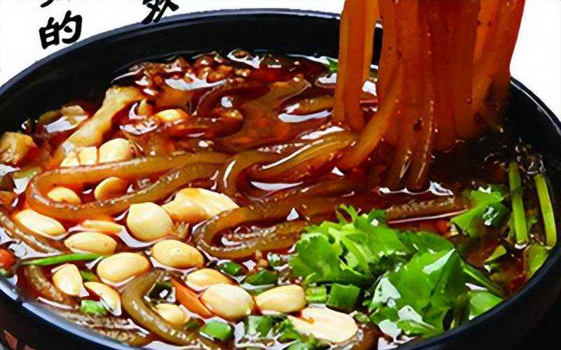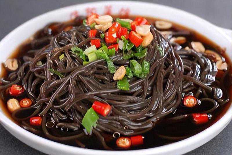4.锅烧热下油,黄豆炒熟,下花生碎,黄豆芽,芽菜末,猪肉末一起炒香出锅倒在备好的粉上,再把调味汁3,淋在上面,拌匀即可食用。