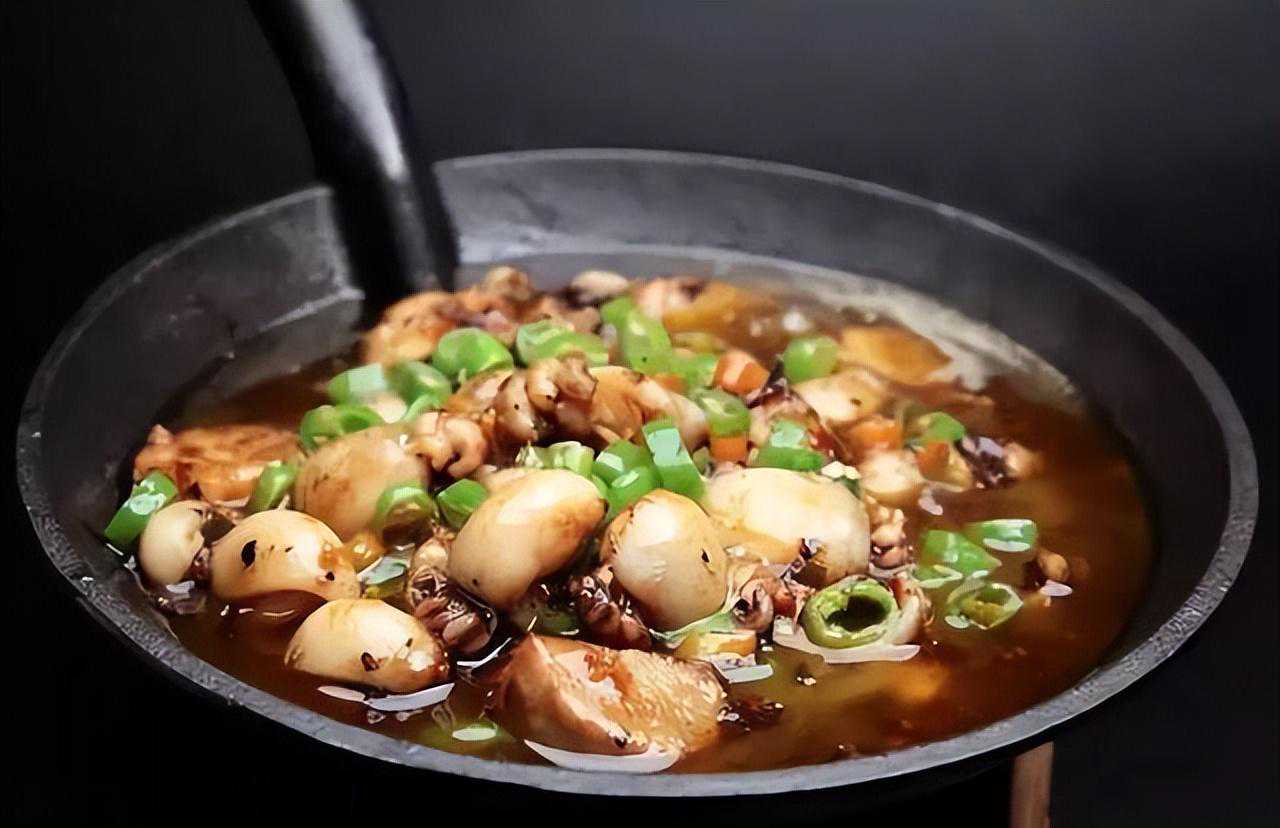 3.锅里放熟菜油烧热,下烧椒酱稍炒后,再放入墨鱼仔和小芋头翻炒均匀,起锅前加入青椒圈和少许黑胡椒碎,出锅装入容器内。上桌后点火加热食用,效果更佳。