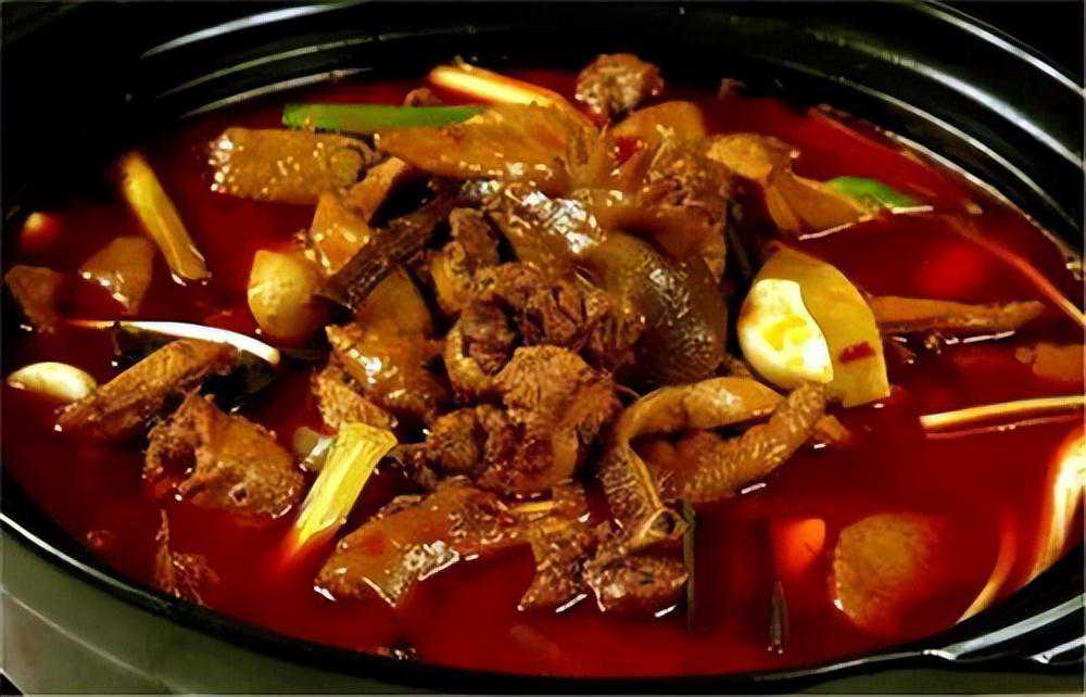 2.牛肉冲水,进入卤水卤熟。切丁。