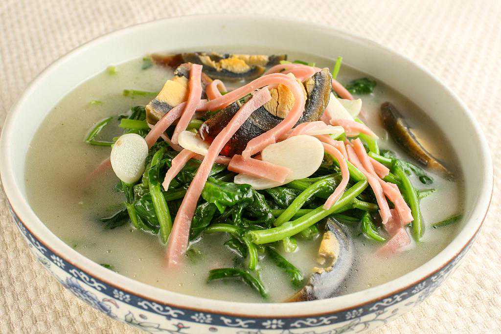 菠菜、草菇、火腿片、枸杞、松花蛋、咸蛋、高汤、姜、蒜、盐