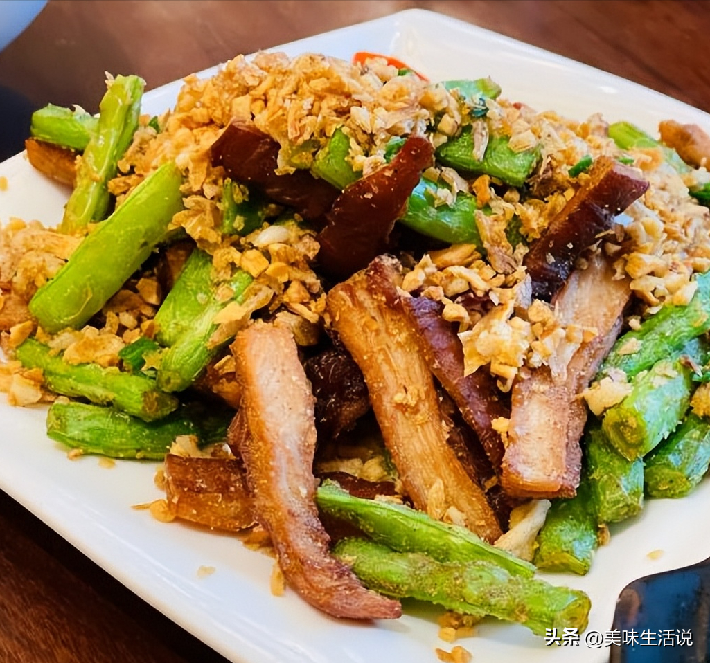 干煸四季豆与肥肠搭配炸过的蒜粒,肥肠煸的很干一点也不腻,干煸豆角的既视感,十分下酒。