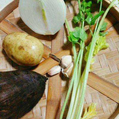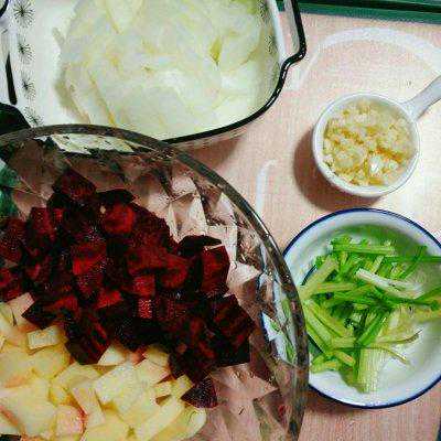2、甜菜根和土豆去皮切丁,蒜头拍碎切末,洋葱切丁,芹菜摘掉叶子切小段(芹菜叶可以用来煎蛋饼哦,很香的呢!)