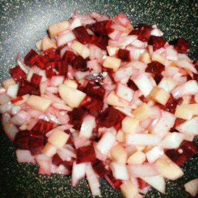 5、倒入土豆丁和甜菜根丁一起翻炒均匀