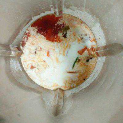 8、把蔬菜汤稍微晾一会,倒入料理机,加入奶油,按蔬菜汁按钮打30秒左右就可以了