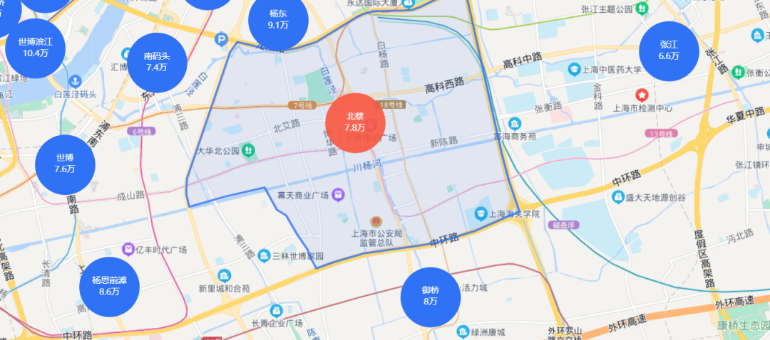 在地图上看,北蔡的区位优势很明显,北接花木,西接杨思前滩,东靠张江。