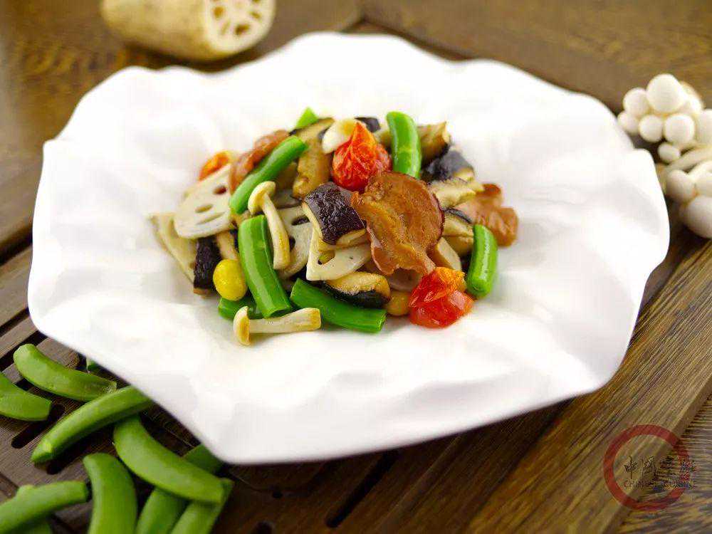 锅入油烧热,入鱼粉煸香,加二汤、盐、味精、白糖煨至入味,放入冬菇块、榆耳、莲藕片、白玉菇、甜蜜豆、白果、小番茄块大火翻炒均匀,勾薄芡,出锅前加入火麻油翻炒均匀,码盘即可。