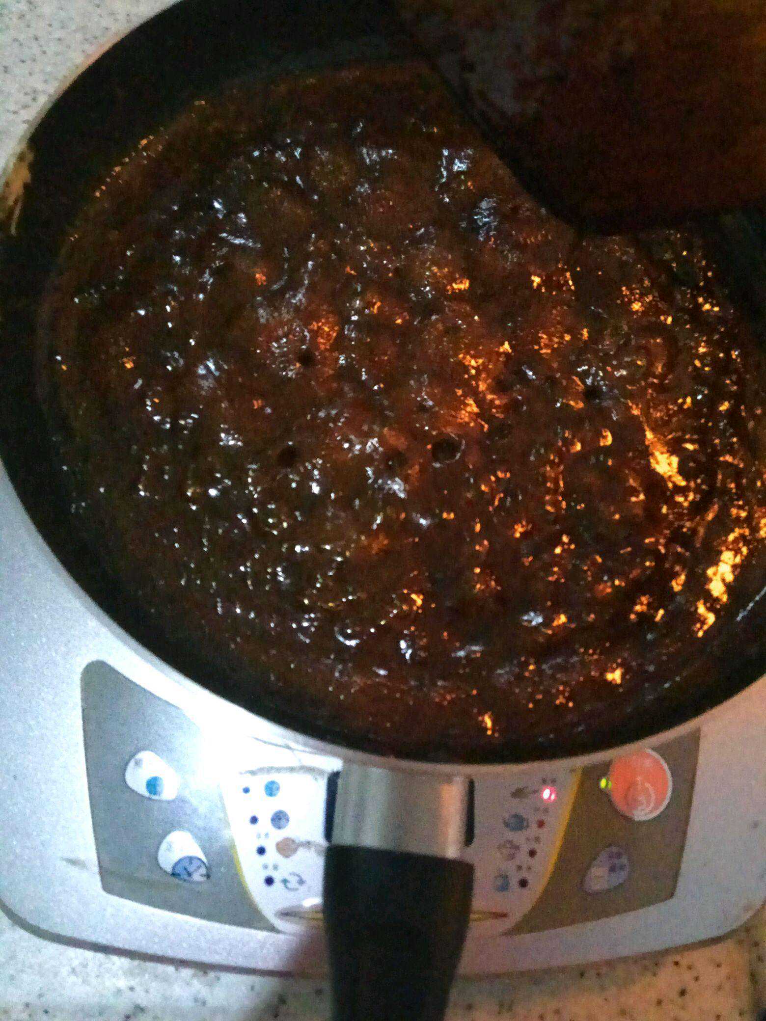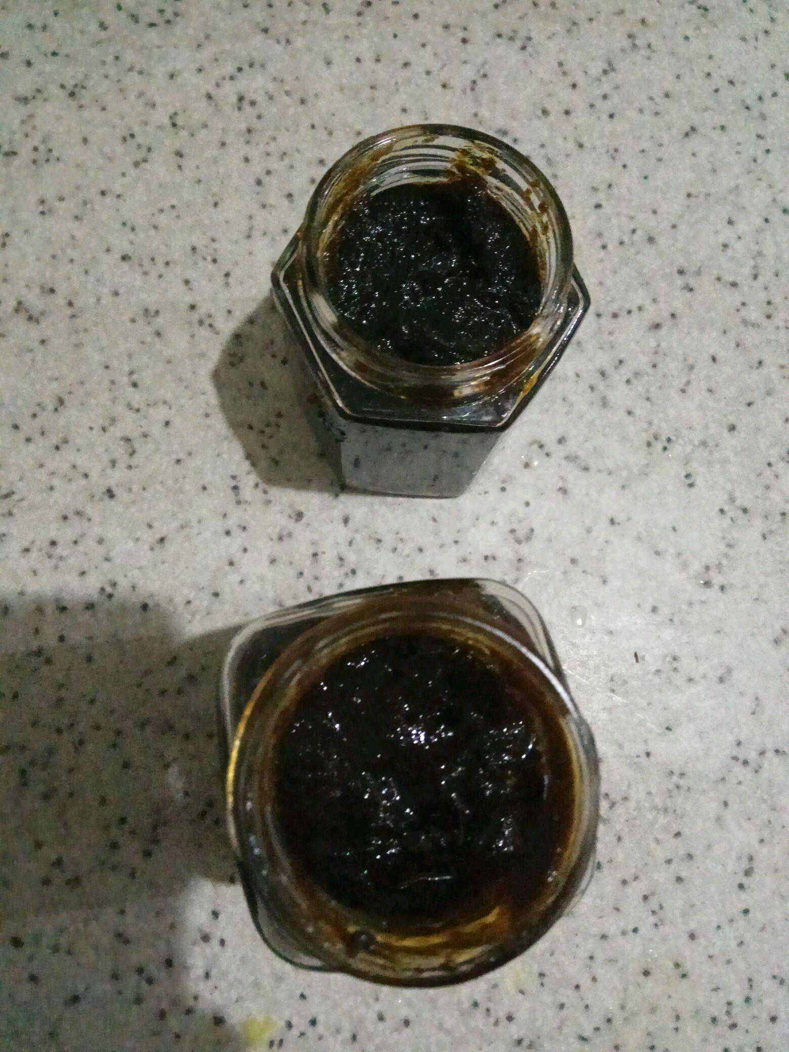 5.到成膏状时关火。忍不住尝了两口又甜又辣,好吃过瘾,把玻璃瓶放沸水里煮一下消毒,控干。