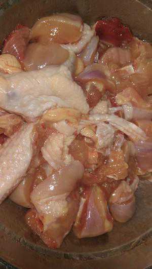 1.鸡肉斩成小块,用食盐、胡椒粉腌底味,再用湿淀粉搅匀,最后倒入少量花生油腌半个小时。