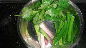 2.生抽、老抽、蚝油、白糖调成酱汁备用;香菜、小葱切段,分葱白和葱青。