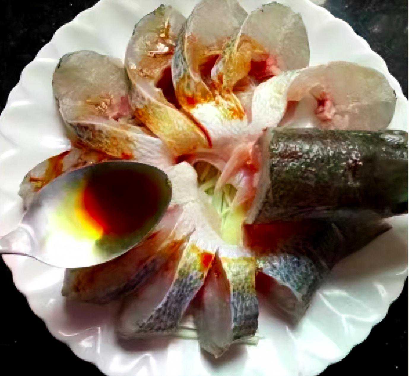 4、鲈鱼肉摆盘做成一个孔雀开屏的形状,铺上葱姜去腥、淋上蒸鱼豉油料汁。