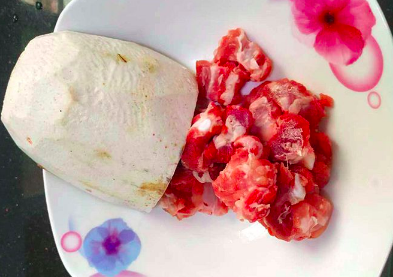 2、猪肉洗净切碎,3分肥肉7分瘦肉,莲藕洗净切成夹刀片。另外的莲藕切成藕丁。