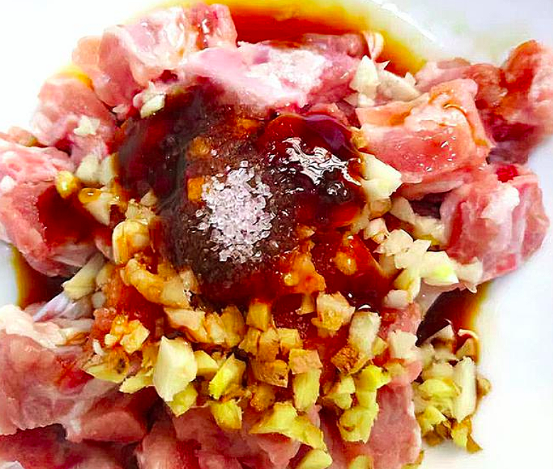 4、把腌制入味的猪肉放入电饭煲里,倒入腌制的料汁也一起下锅。选择煮饭模式,一个程序走完成。