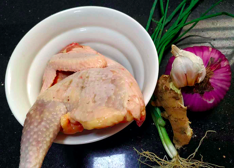 2、鸡肉处理好洗,葱洗净切段、红葱头洗净切丁、生姜洗净切片待用。
