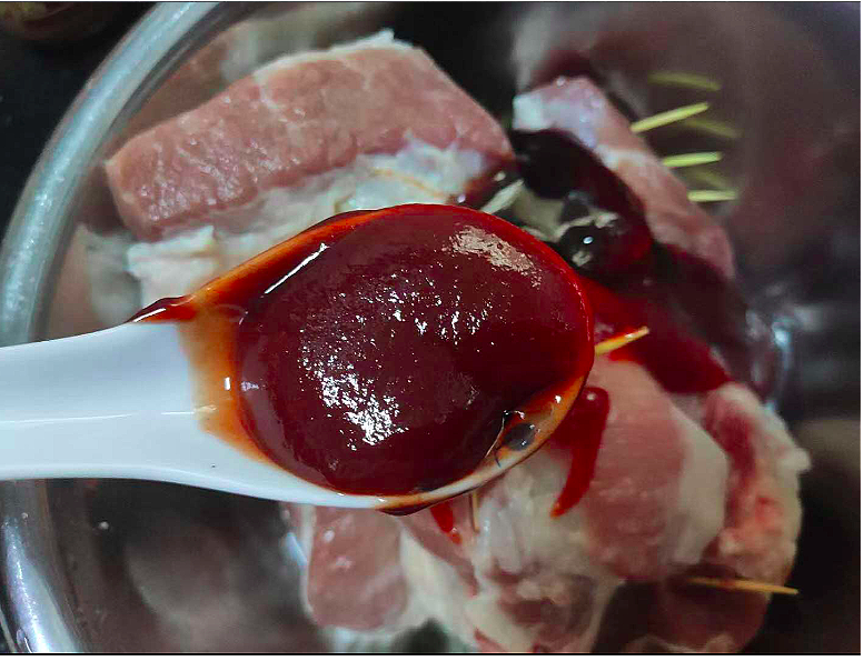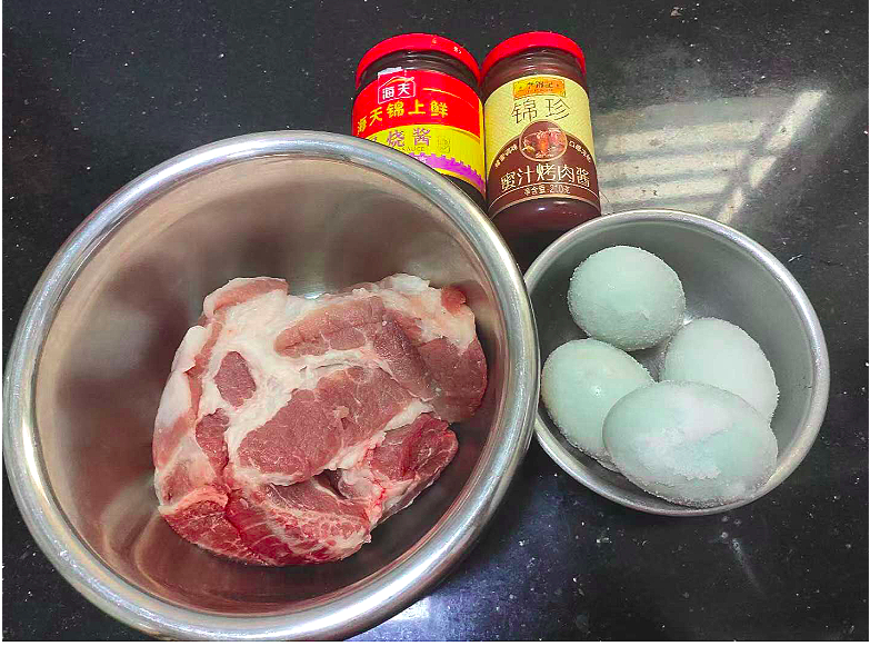 1、食材:梅头肉、咸蛋黄、叉烧酱、蜜汁烤肉酱。
