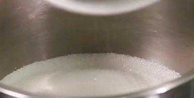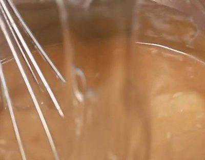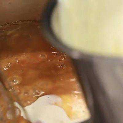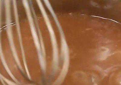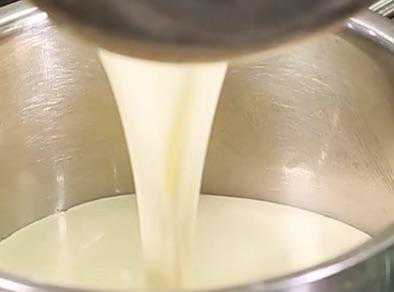 3、分次加入煮开的淡奶油,一边搅拌一边倒入淡奶油