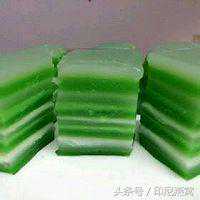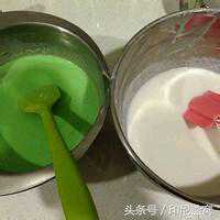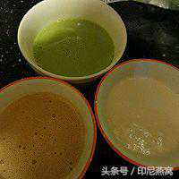5.接下来开始蒸至水开后用一个不锈钢的深一点的碟子往里面抹点油放入水中先蒸白色的放一勺盖上盖1-2分钟变成完全透明后表示它已经熟透了可以加第二勺同样步骤蒸完三层之后蒸绿色同样是三层一定要蒸透否则就熟不了了,蒸完绿色后再蒸咖啡色同样三层最后再蒸绿色至最后一层熟透即可