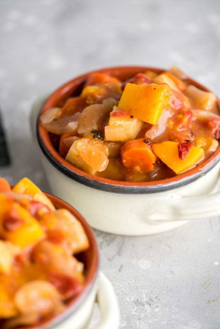 这种丰盛的慢炖锅炖菜煮非常适合寒冷的秋冬季。食物准备几分钟后,然后在慢炖锅中煮5个小时,直到蔬菜在您的口中融化。味道鲜美,带有淡淡的甜味,这道菜的脂肪和卡路里含量低,充满风味和营养。