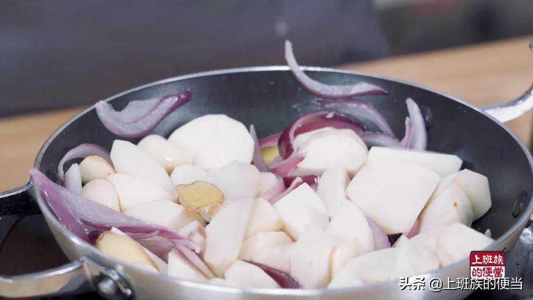 锅里留2勺底油,放入姜片、蒜瓣、洋葱丝爆香,再放入芋头块炒香;