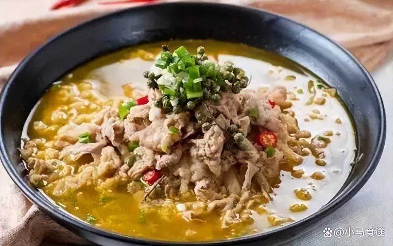 2.锅入酸汤烧开,放入金针菇、木耳、肥羊卷煮至入味,出锅倒入老碗中,撒青红美人椒圈、蒜米、鲜花椒,淋上热油即可。