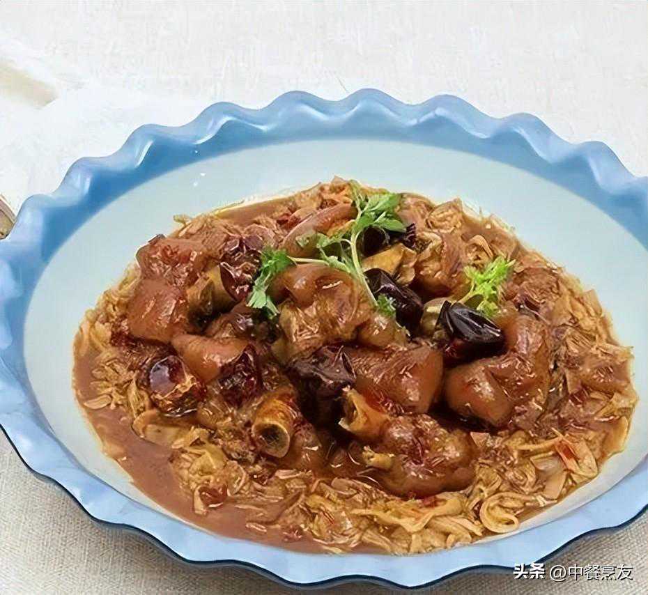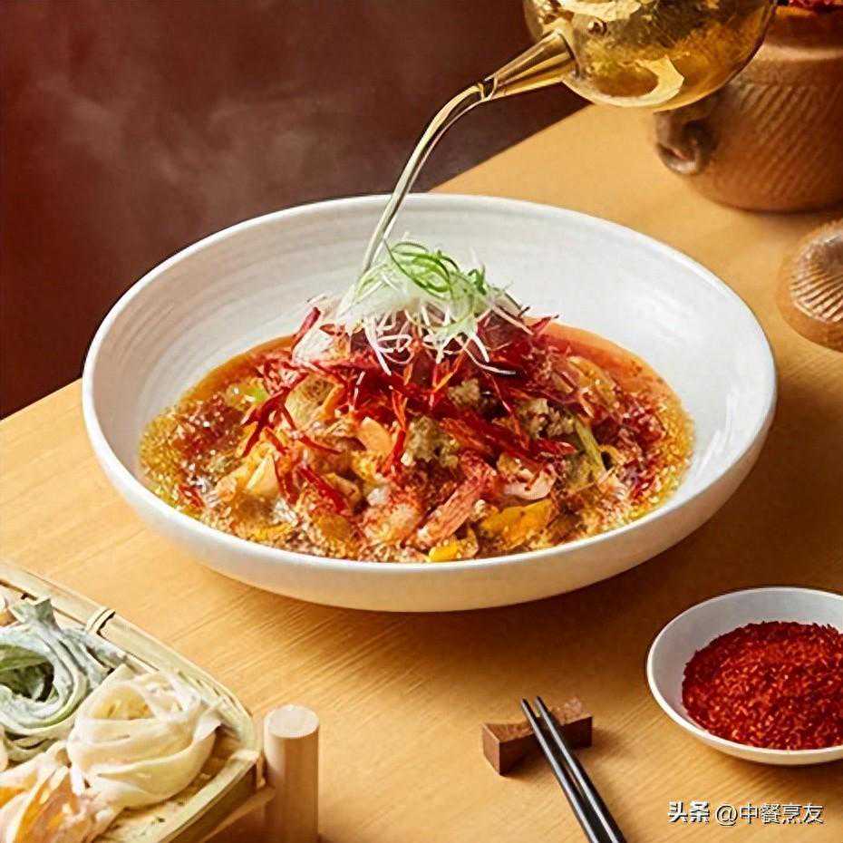 3.原汤回锅加脆笋煨制片刻,捞出打底,主料回锅。收汁并淋辣鲜露,码芡追尾油装盆,香菜段点缀即可。
