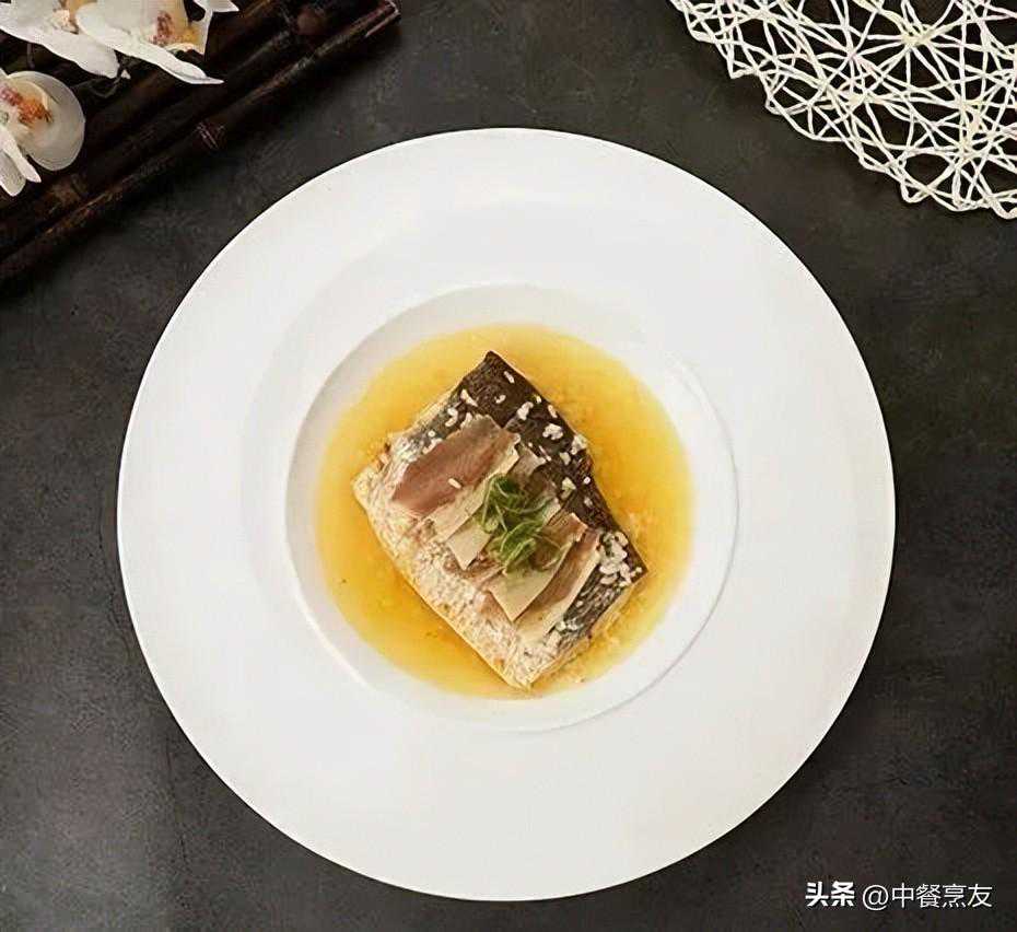 3.把笋片、姜片、火腿片均匀摆在鱼身上,最后放上酒酿、调味料,鸡油上笼蒸蒸5分钟、出菜时撒上葱花淋热油即可。