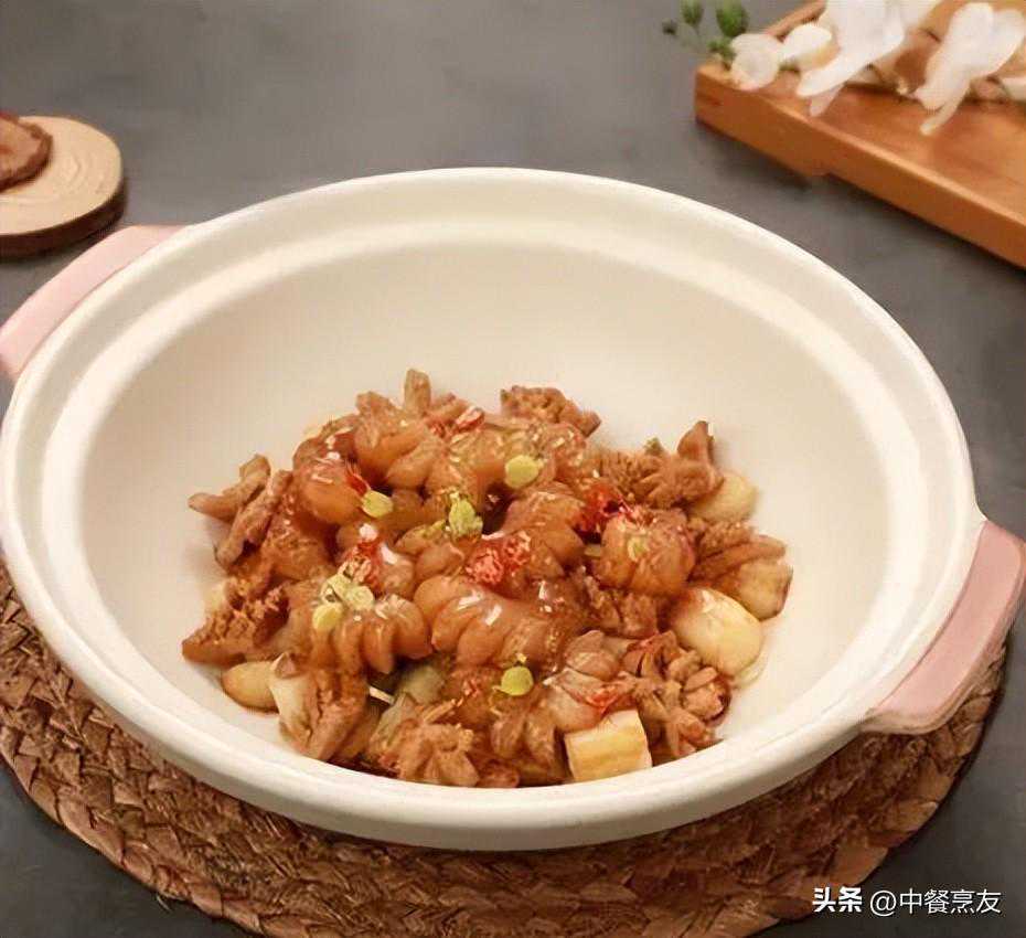 3.煲仔烧热,放入京葱炒香,放入蒸熟的山药段,把收汁的牛鞭装入,撒上小米椒碎、青大蒜花即可。