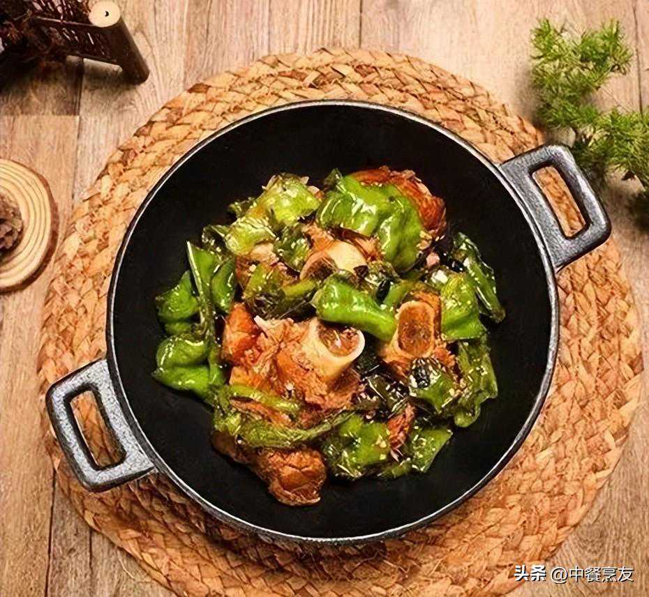 2.青椒去蒂去中间籽,热锅不放油,炒制小米辣,青椒有点糊状下入油炒一下,放入豆豉和卤好筒子骨一起翻炒,下入料酒、清水200克,闷两三分钟,下入家乐辣鲜露,家乐双蚝蚝油,家乐鸡精收汁,就可以起锅装盘了。