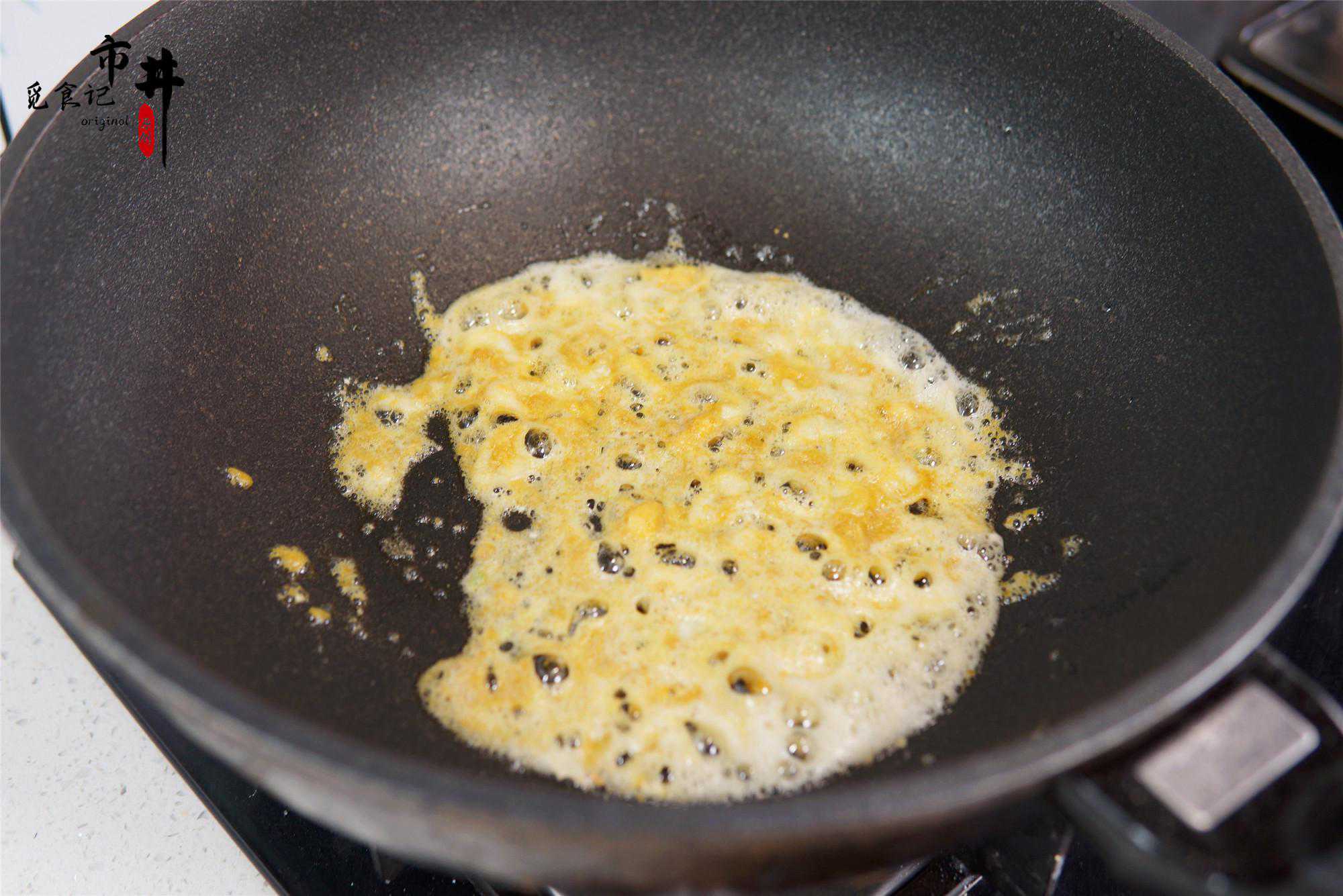 第三步:炒锅中加入少量的油,油热后加入咸鸭蛋碎,不断的翻炒,至咸鸭蛋黄出油。
