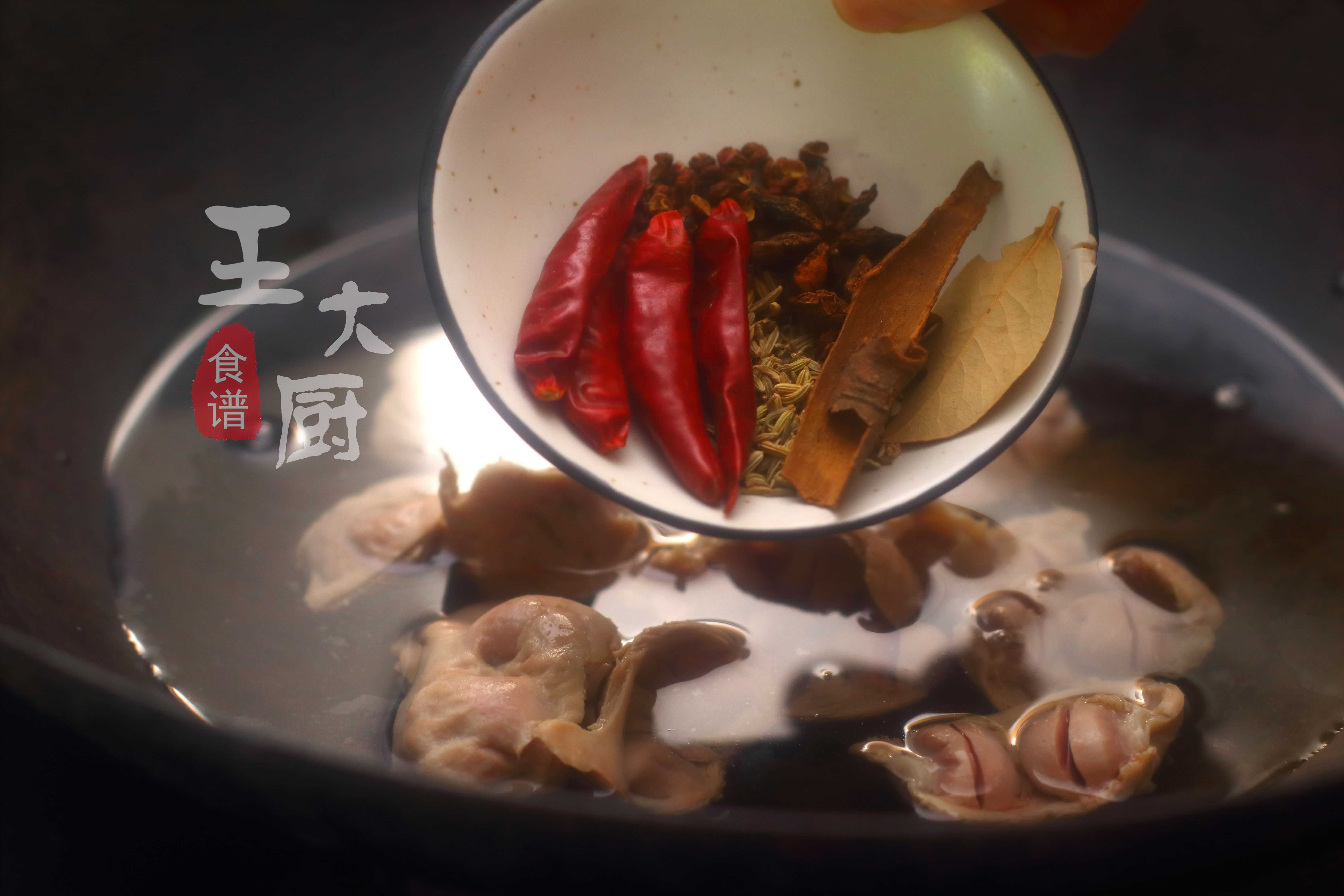准备食材:鸡胗、桂皮、干辣椒、孜然、八角、花椒、香叶、葱花、姜片、蒜片等。