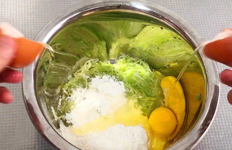 接着加入一勺面粉,2个鸡蛋,适量盐和白胡椒粉,顺着一个方向搅拌均匀,搅至没有面粉颗粒,变成面糊为止。如果面粉加多了,就再打一个鸡蛋,不要加水,不然吃起来会发硬,用蛋液搅的面糊凉了也不硬。