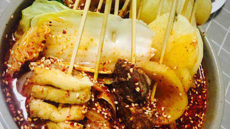 取一个小的火锅盆或钵子,在调入盐30克,味精20克,鸡精15克,孜燃油3克,花椒粉5克,极品罂子粉5克,红油1500克(根据自己的锅大小加),芝麻香油5克,藤椒精油5克把上面烫好的串串放到里面侵泡好,上桌不开火就可直接吃