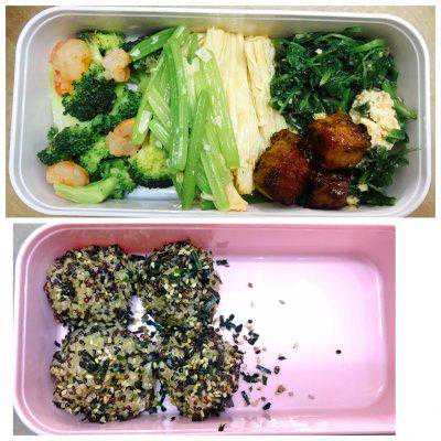 3、西兰花虾仁、西芹炒腐竹、黑椒牛肉粒、茼蒿、藜麦鸡肉丸