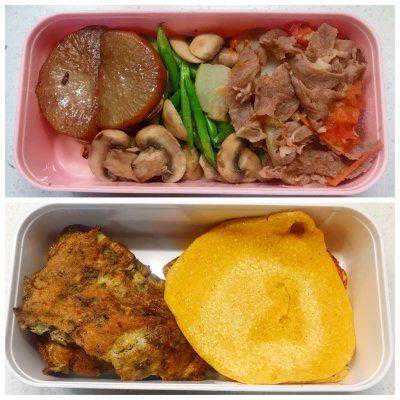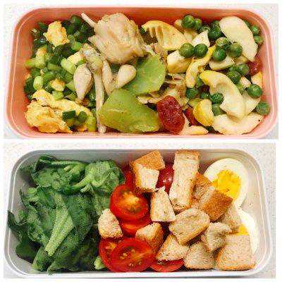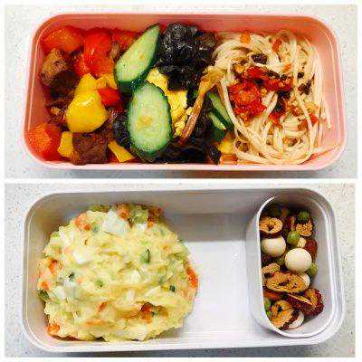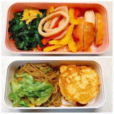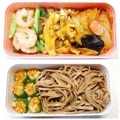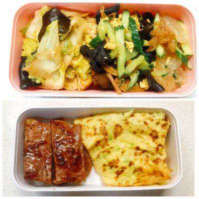 29、韭菜炒鸡蛋、彩椒鱿鱼圈、鸡胸肉、圆白菜炒红薯粉、萝卜丝饼