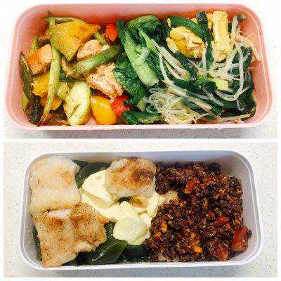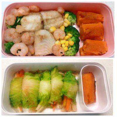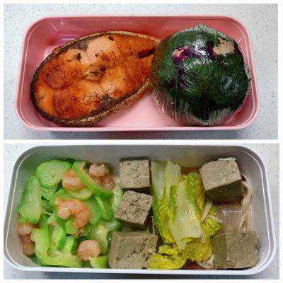 25、烤三文鱼时蔬、小白菜、韭菜炒绿豆芽、海带豆腐、香煎巴沙鱼、藜麦黑米炒饭