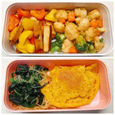 4、韭菜炒豆芽、彩椒炒鸡蛋、春笋炒豌豆香肠、豆皮鸡肉卷、烤蜜薯