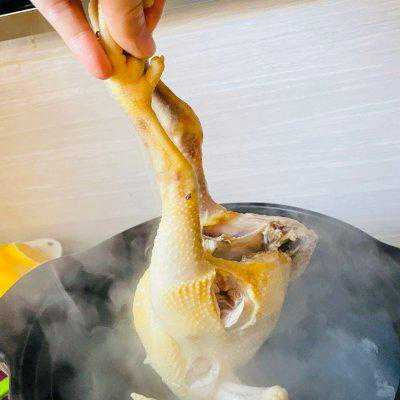 3、拎着鸡的脚,浸入水中5-10秒,提起来5-10秒,再浸入水中,反复三次,这样的作用,是让鸡的毛孔经过几次张开、收紧,让它的表皮更紧致。