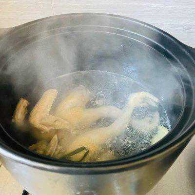 4、放入水中,整个鸡浸入水中,水烧开后转小火,不用盖盖子,小火煮35-40分钟,根据鸡的大小调整时间。