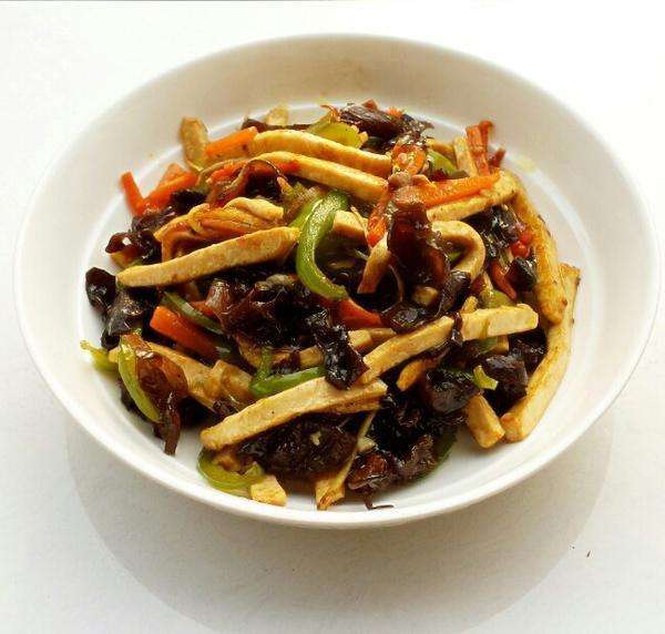 用料:卤水豆腐(老豆腐)250克、水发木耳50克、胡萝卜50克、尖椒30克、米醋15ml、白糖15m1、红烧酱油15ml、胡椒粉,蒜末,味精适量、盐2克、生粉1小勺、水淀粉1小勺;