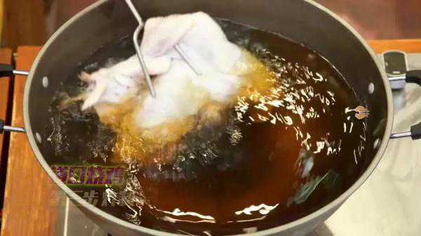将鸡挂起来风干,然后涂上蜂蜜,下锅炸制,炸至表面金黄后捞出。