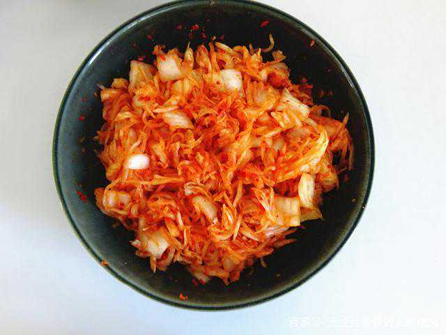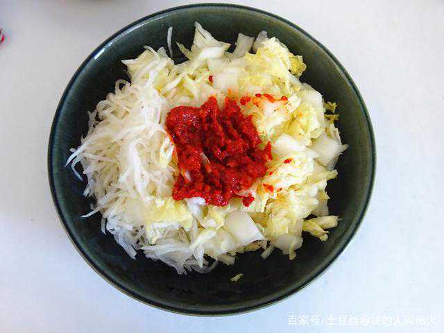 7、把萝卜丝和白菜块都攥出水分,放入妙拌酱,可以先少放,拌了在品尝后再加,一直到自己喜欢的口味就行了。