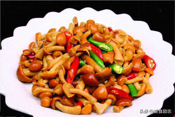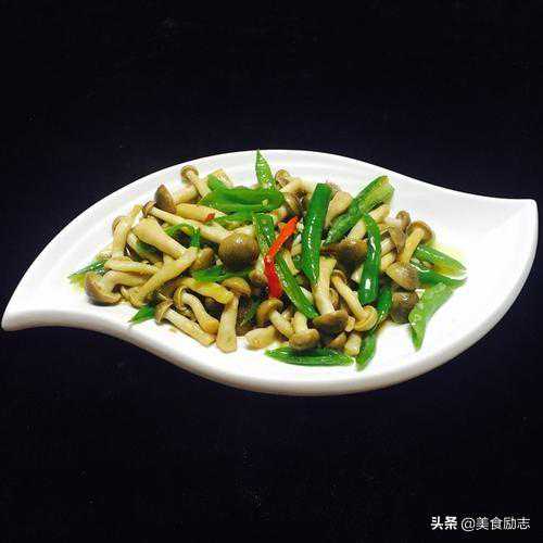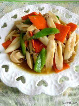 2.炒锅加油烧热,下鸡腿菇片。胡萝卜片,青椒片,加盐,鸡精翻炒均匀,用淀粉勾芡,淋葱油即可。