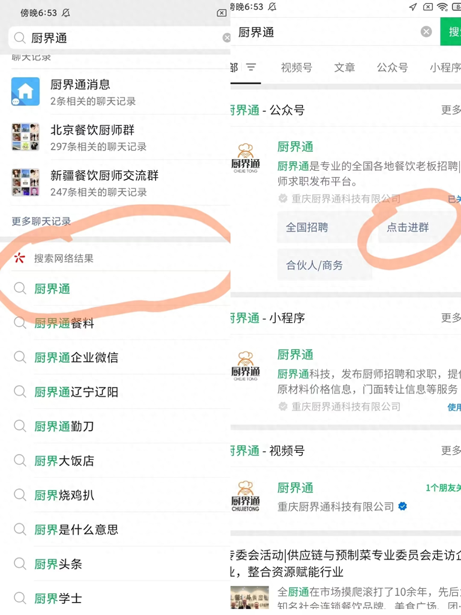 打开要入群那个软件搜索厨界通如图所示点击