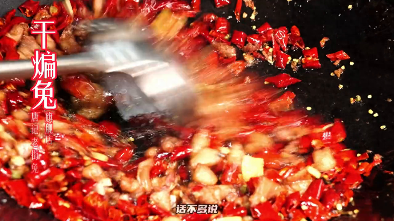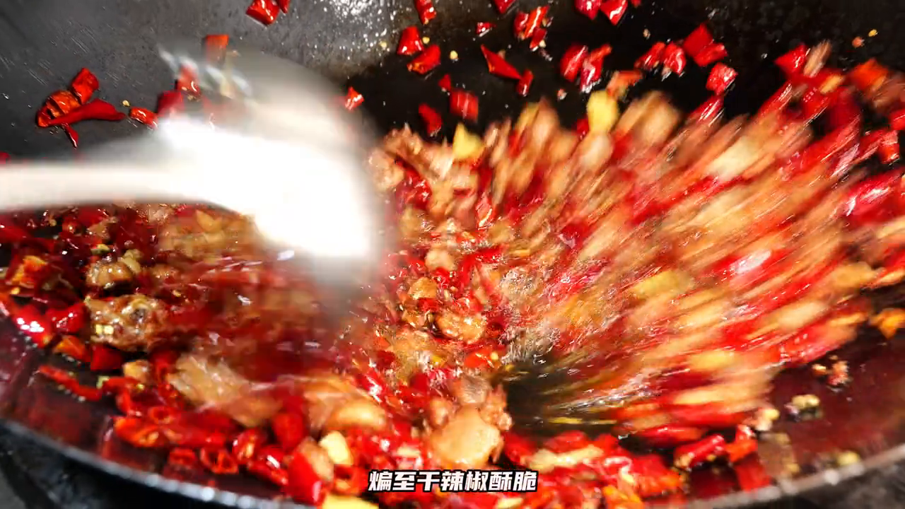 ·锅中放入菜籽油,放入花椒、干辣椒,吃的辣的可以加魔鬼辣、大料、八角,煸至干辣椒酥脆,再放入炸好的兔儿丁。