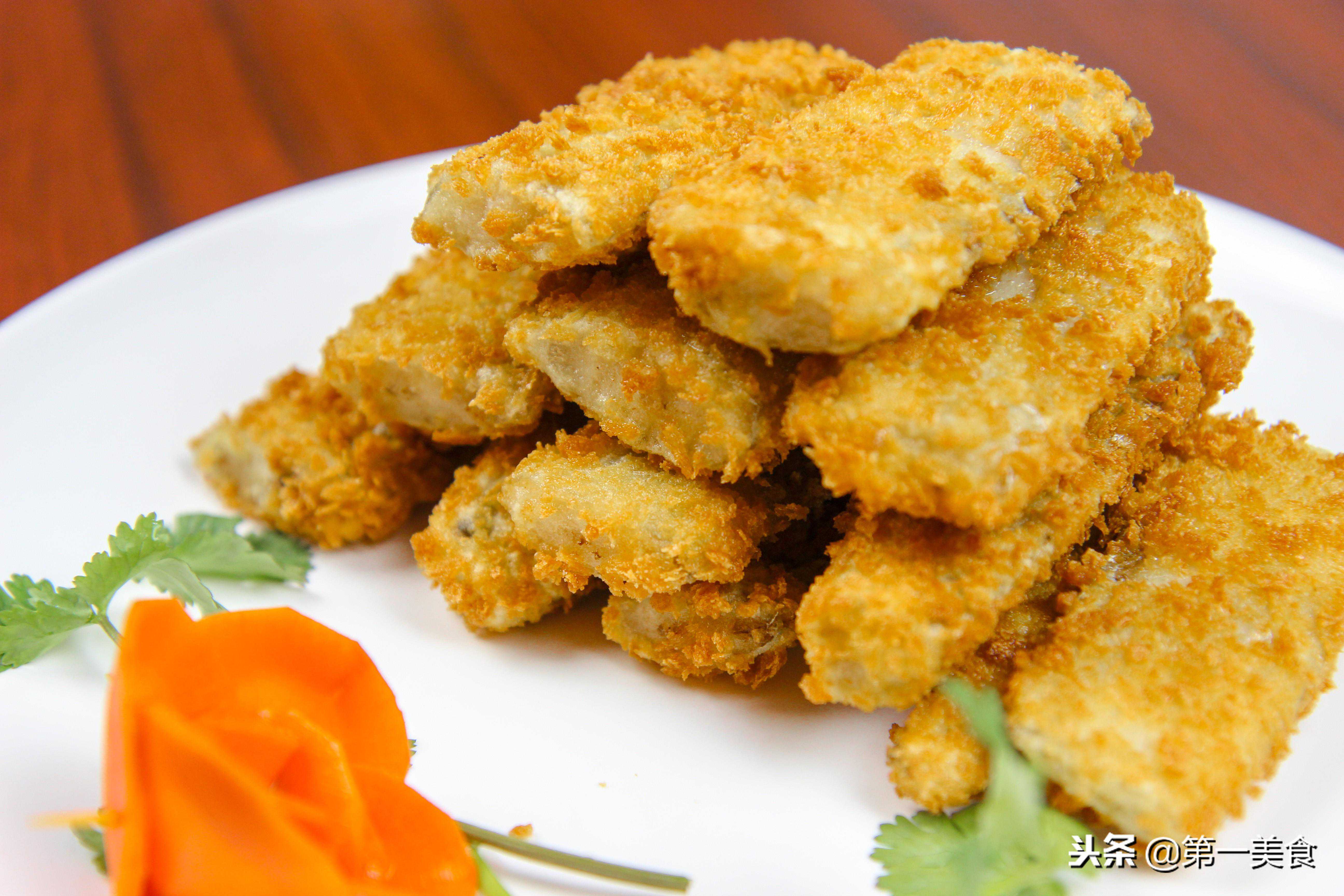 另外准备三个小盆,一个打入鸡蛋,一个放干淀粉,一个放面包糠。我们把带鱼先沾上淀粉,再浸好蛋液,最后沾上面包糠。一块一块的处理好以后,放在盘子里备用。
