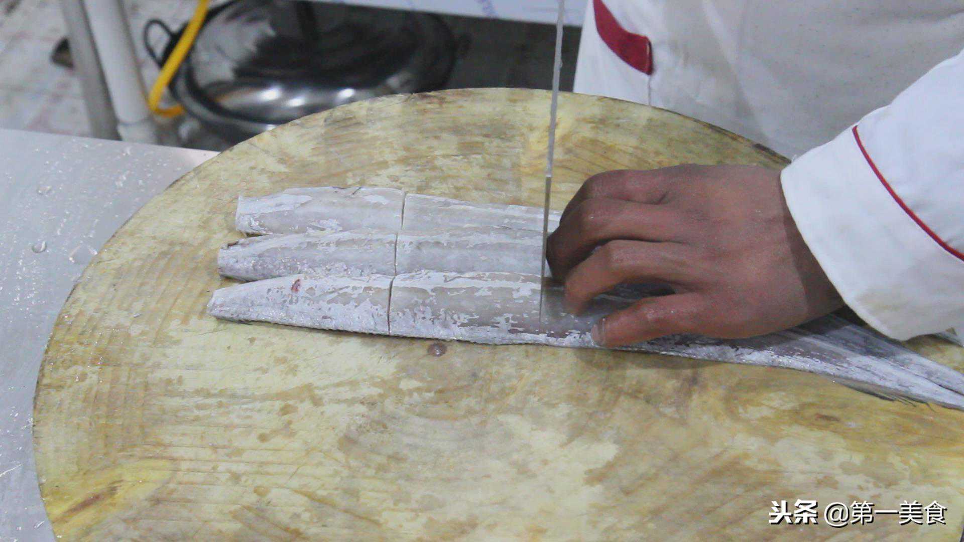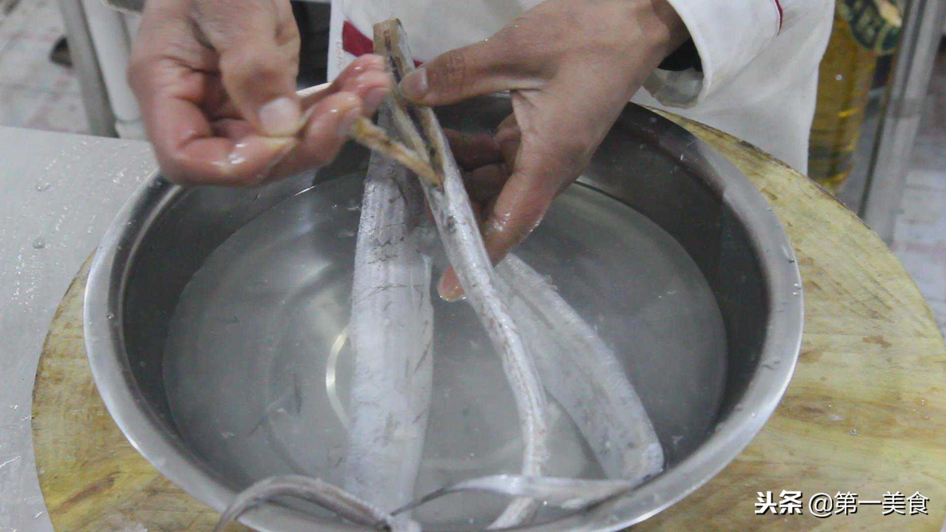带鱼三条,划去鱼鳍,切掉鱼头,掏去内脏。然后用水洗干净。