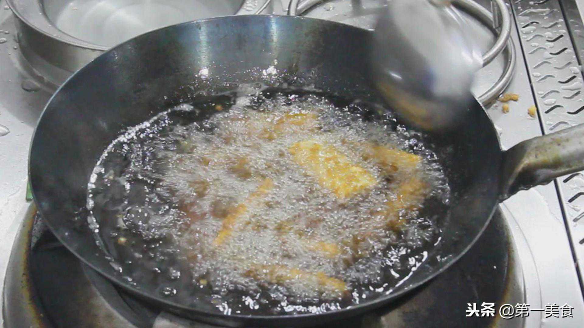 锅里倒油,油烧至5成热,放入带鱼。一直开中小火,慢慢炸至金黄色,然后捞出控油。
