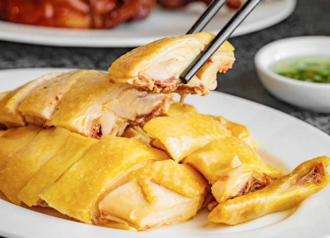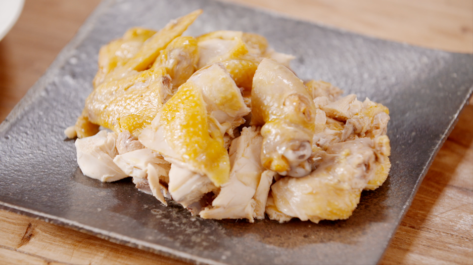 洗净的鸡肉先在微滚的白卤水中上上下下烫煮几次,保证鸡肉内外的温度平衡,随后在90°C的白卤水中浸泡25分钟,再“过冷河”(冰水)降温,只有这样鸡肉吃起来才会特别嫩。