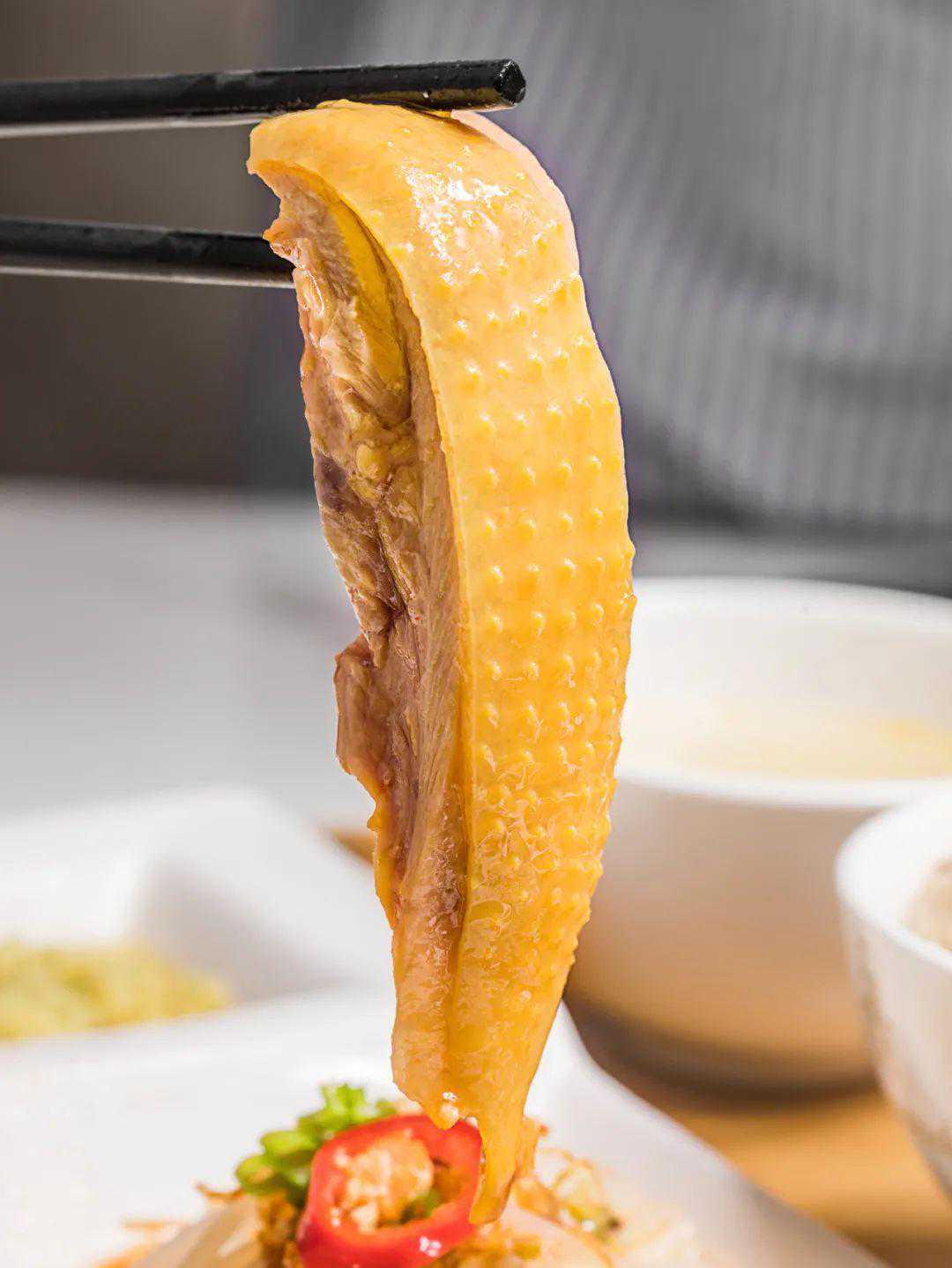 做好的白切鸡鲜味被完全激发出来,斩块上桌后鸡皮油亮透光,鸡肉肌理细嫩。黄灿灿的鸡皮与滑嫩鲜香的鸡肉中间是一层啫喱状的胶质,看着就感觉清凉。