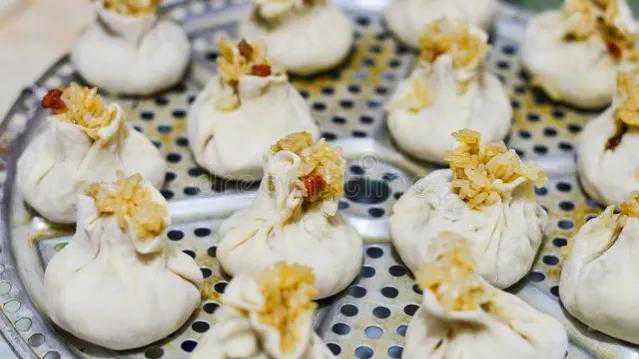 2.取一大盆,放入高筋粉、冷水,和成面团,发10分钟,将面团搓成长条,揪出剂子,擀成圆皮,逐个包入馅料,做成门钉形状,即成生坯。